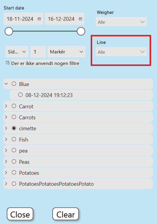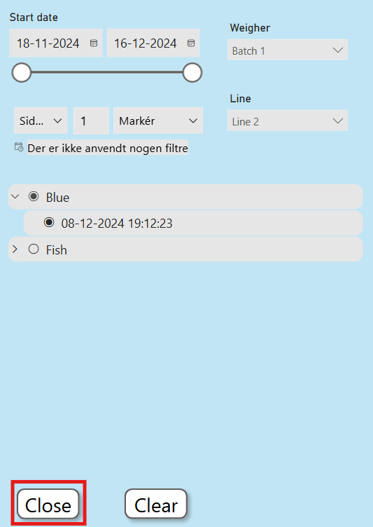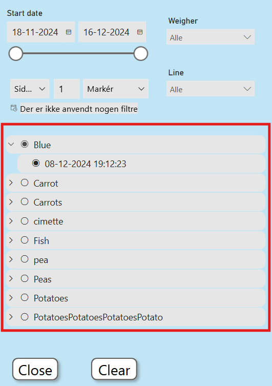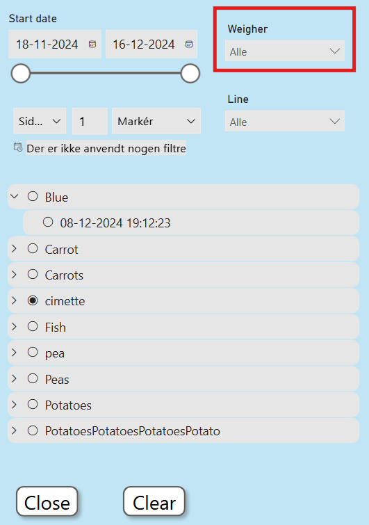 WeigherLog shows weighing data based on a selected production.